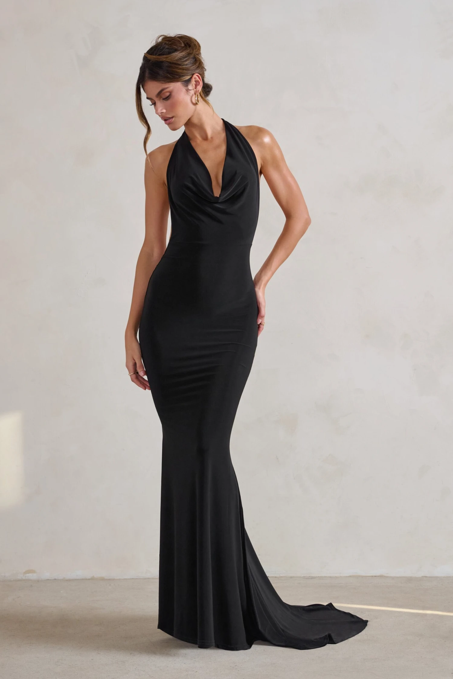 For effortless elegance this party season, there’s no maxi dress quite like Saffina. Crafted from our premium black jersey with a hint of stretch to contour your curves, this floor-sweeping maxi dress boasts a fishtail silhouette with a plunging cowl neckline and a dramatic open back. Complement the classic hue of Saffina with gold accessories at your next formal event.