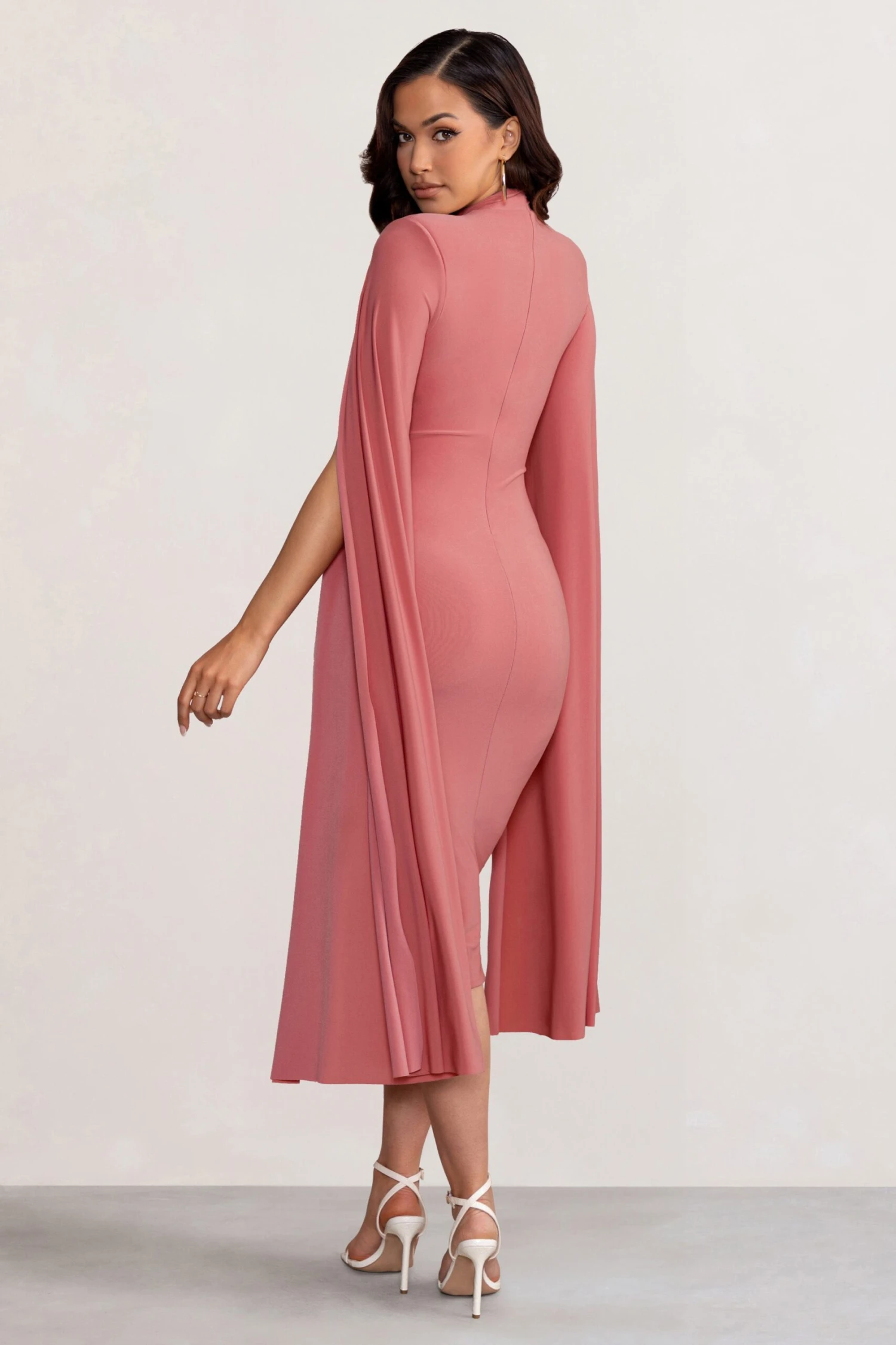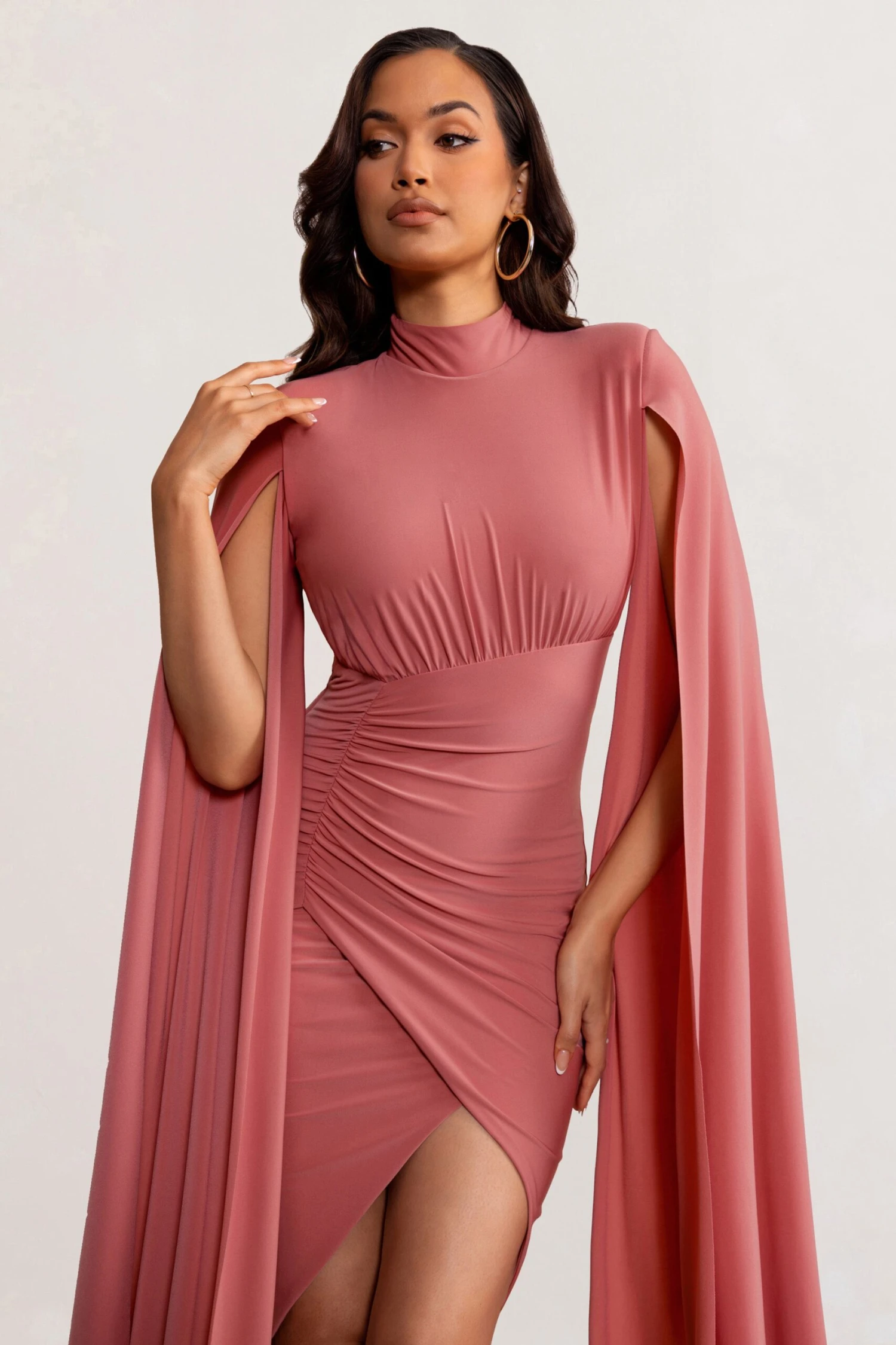 Turn up the glamour in our Sara midi dress. Designed to make a statement with its striking cape sleeves and in a feminine blush pinkhue, this dress is a must-have for your next special event. The thigh split is balanced with a demure high neckline white the ruching cinches you in and emphasises your curves. Perfect for a wedding guest look or christening, our Sara midi is the one!