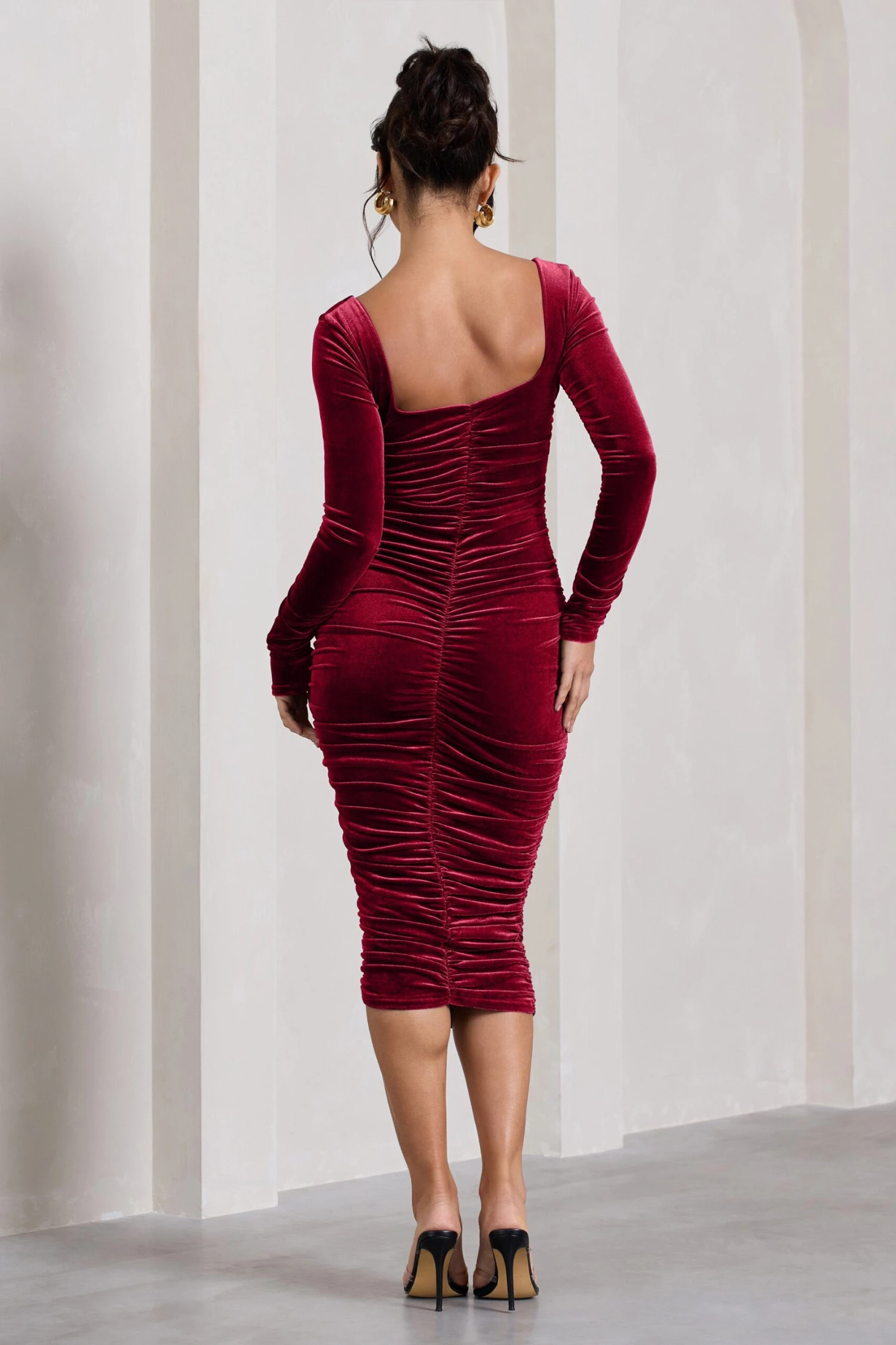 Carefully crafted in a premium stretch velvet, this form-flattering midi is a must-have for any formal wardrobe. Seductress arrives in a rich berry shade and boasts a supportive square neckline, full body ruching and a sculpting bodycon silhouette. For a sophisticated dinner date ensemble, try pairing this alluring midi with a sleek bun and statement earrings.
