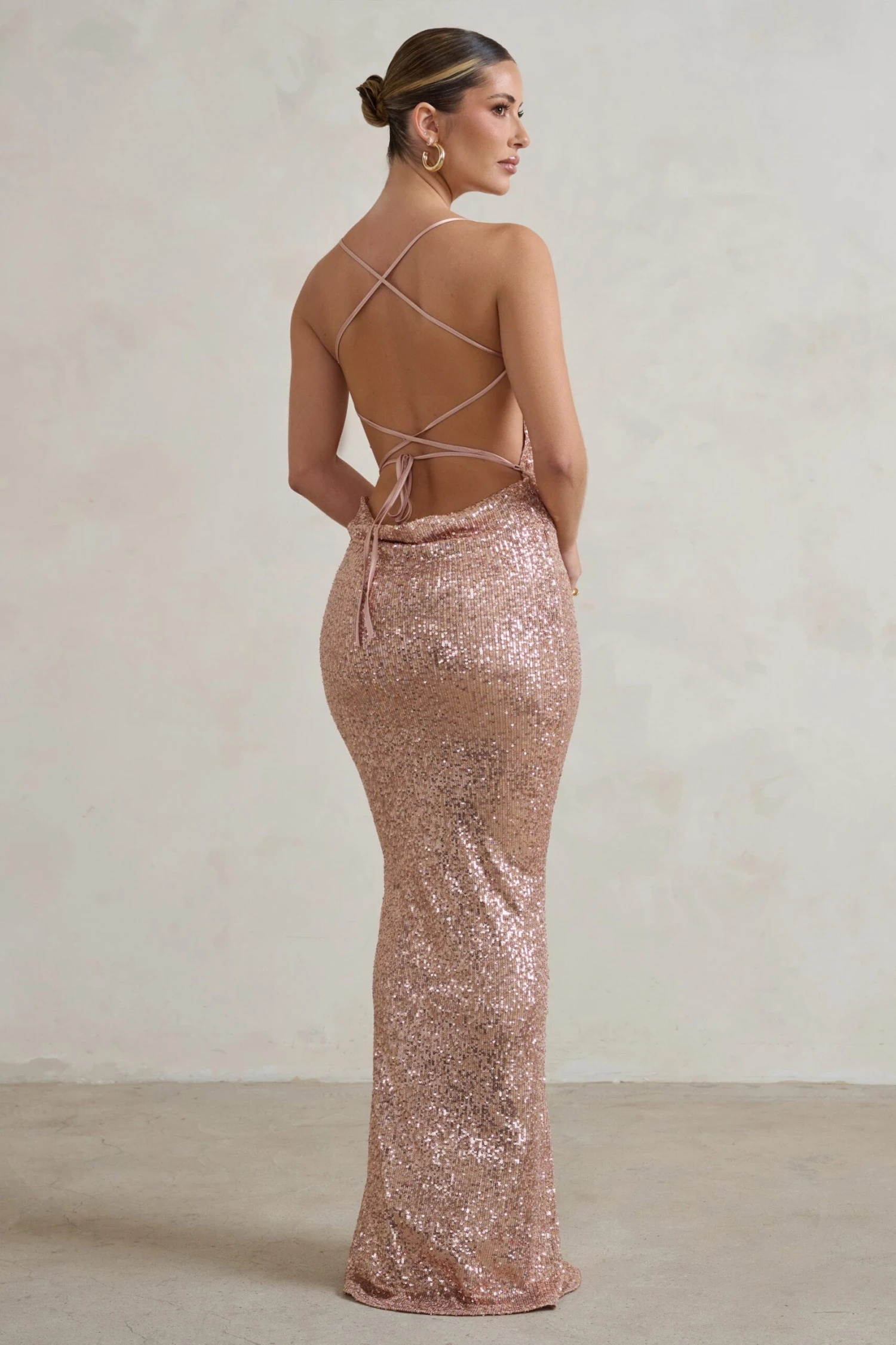 Cosmically named and marvelously contouring, Seeing Stars is the maxi dress to make an impression at your next formal event. The draped dress arrives in sequined champagne satin that’s not only dazzling but fluid and stretchy. Seeing Stars also boasts an open cowl back with lace straps that tie up elegantly. Keep wedding guests envious by pairing this maxi dress with encrusted accessories.