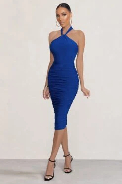 Got that invite but not the dress? Look no further than our Serendipity midi dress! This ultra-feminine midi in a royal blue shade is perfect for your next special occasion with its knot halter neck design and modest hemline. The full skirt ruching with the curve-enhancing stretch-jersey will contour your curves to perfection, ensuring you look glamorous all night long. Wear this midi to your next ladies’ day, bottomless brunch or romantic dinner date. Simply gorgeous!