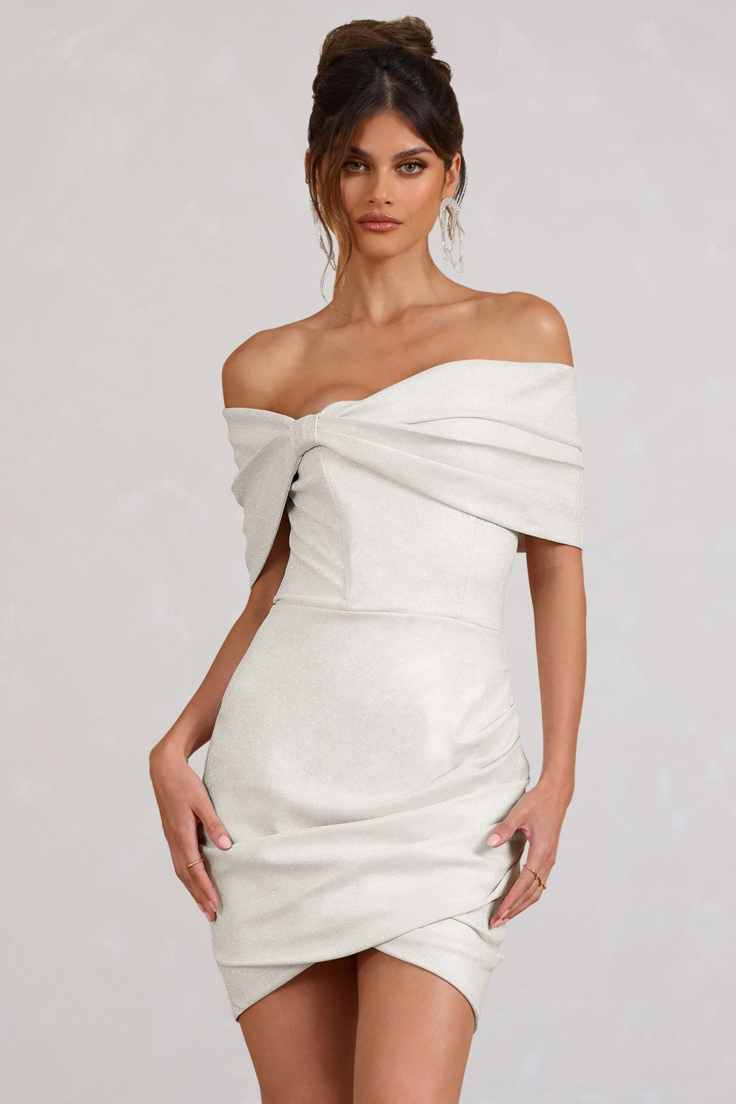Glisten under the evening lights in our stunning Snowdrop mini dress. Designed in luxurious glittered lurex, this silvery white dress features a Bardot neckline wrapped by an oversized bow, sculpting waist seams and a fitted wrap skirt. Why not complement Snowdrop’s sparkle with a few diamond-encrusted accents?