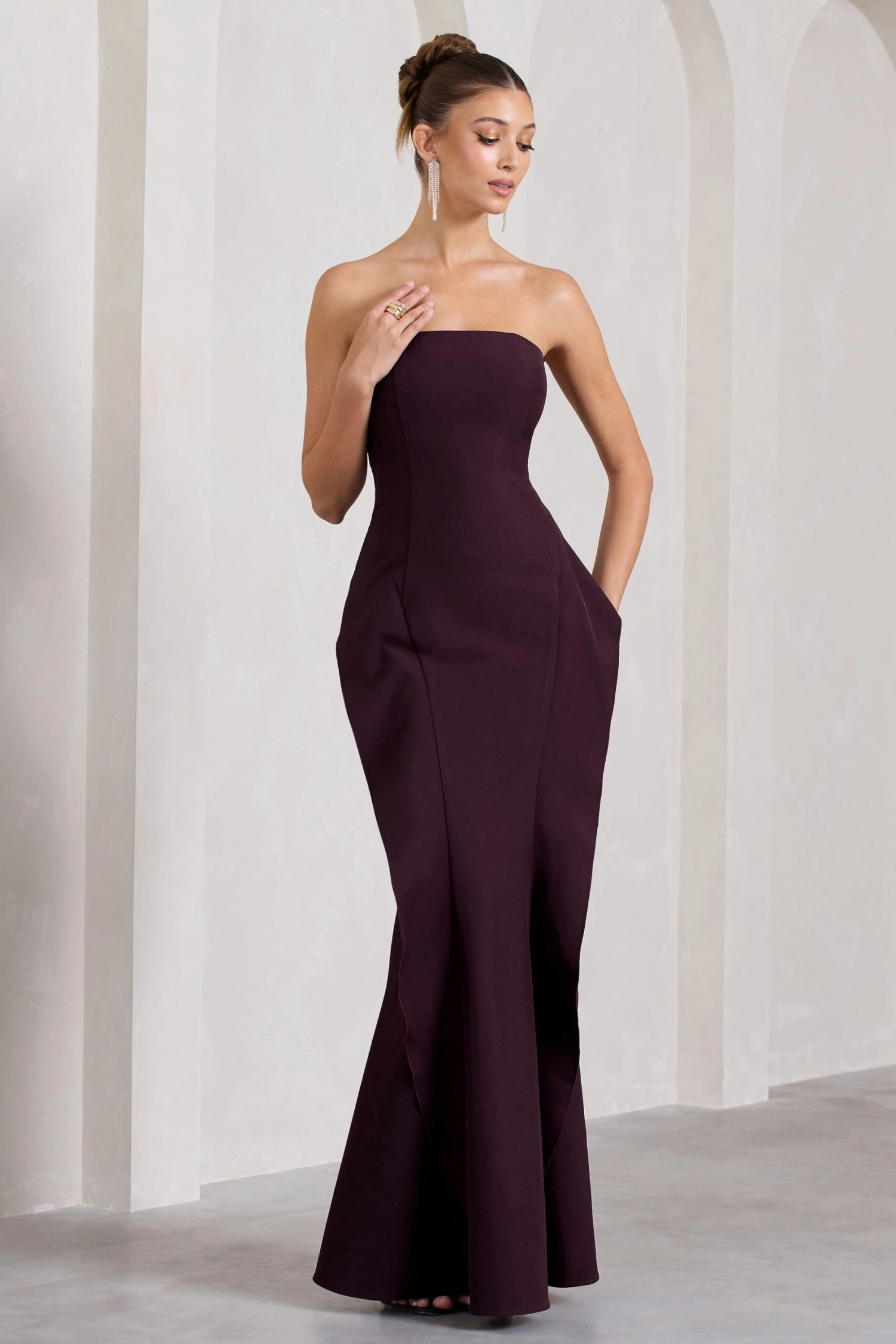 Captivate from all angles at your next event in our plum maxi The Real Thing. Framed in a sophisticated silhouette, this strapless floor-sweeper is defined by figure-enhancing drapes and an opulent fishtail skirt. For the perfect black tie ensemble, try styling The Real Thing with gold accents to enhance its shade.Â