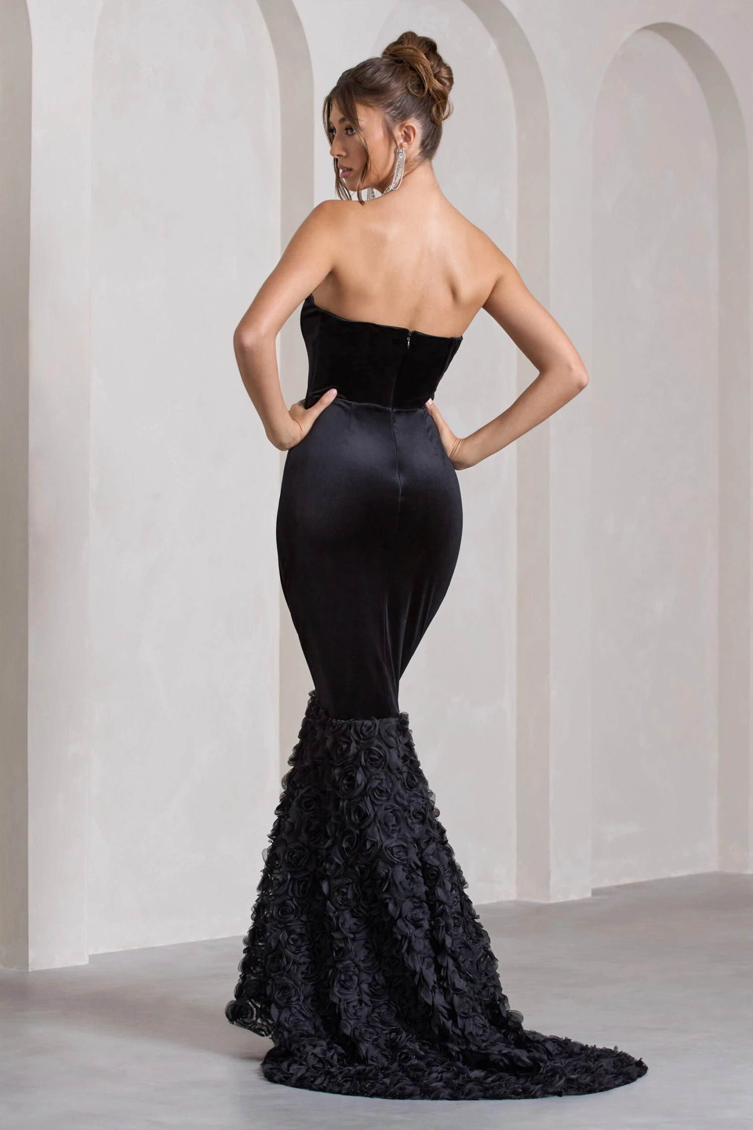 Exude an elegant state of mind this party season in our aptly-named black maxi dress, Whirling. Defined by a floral embellished fishtail skirt, this captivating floor-sweeper is crafted in a premium stretch velvet that effortlessly contours your curves. Boasting a boned corset bodice and wired v neckline, Whirling is as flattering as it is flawless.