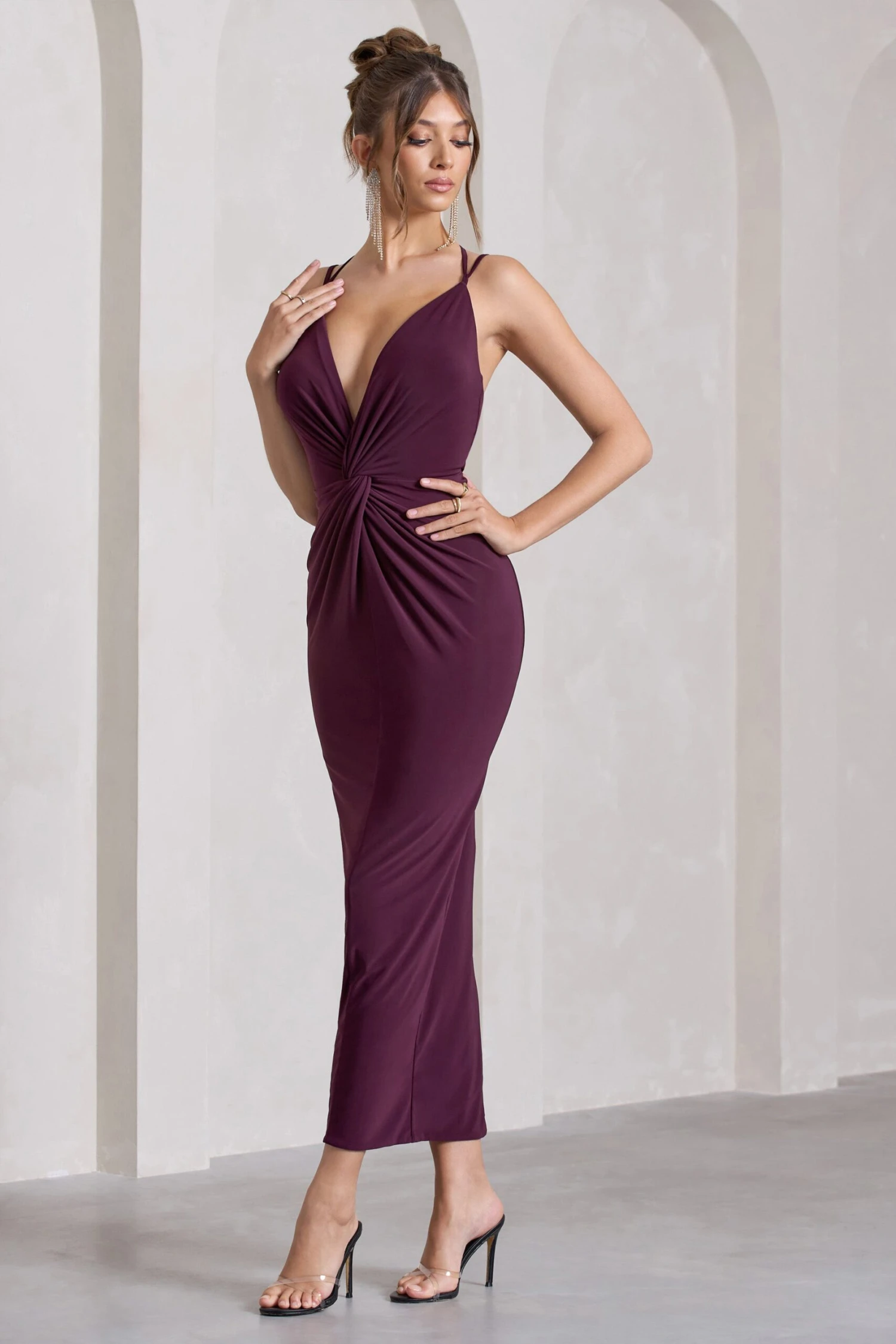 Whether its a black tie gala or wedding event, Yvette ticks all of the boxes. Designed in a rich plum hue, this alluring maxi dress features a sculpting plunge neckline and extravagant open-back thats highlighted by delicately criss-crossing straps. Show off all Yvette has to offer by styling this maxi with a sleek bun and gold accents.